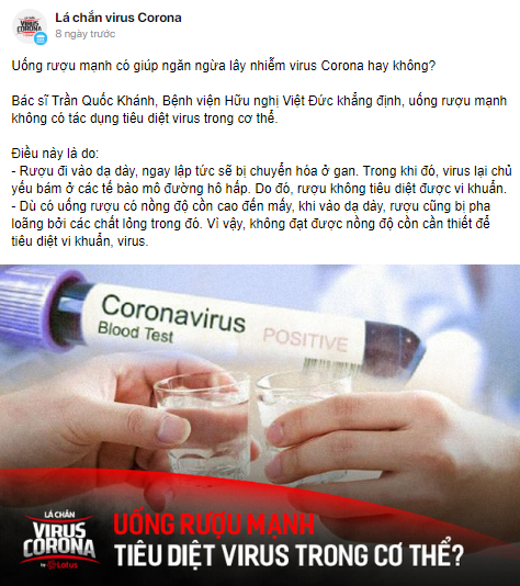 Câu trả lời là Hoàn toàn không. Theo lời một bác sĩ đến từ Bệnh viện Hữu Nghị Việt Đức: Uống rượu mạnh hoàn toàn không có tác dụng tiêu diệt virus, vi khuẩn gây bệnh trong cơ thể. Trên thực tế, cho đến nay, vẫn chưa có loại thuốc hay rượu ức chế được nCoV trong cơ thể.